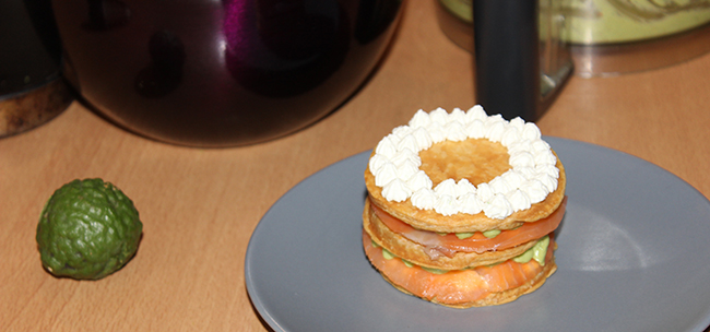 Au programme, mille-feuilles à la truite fumée avec guacamole et crème fouettée au citron.